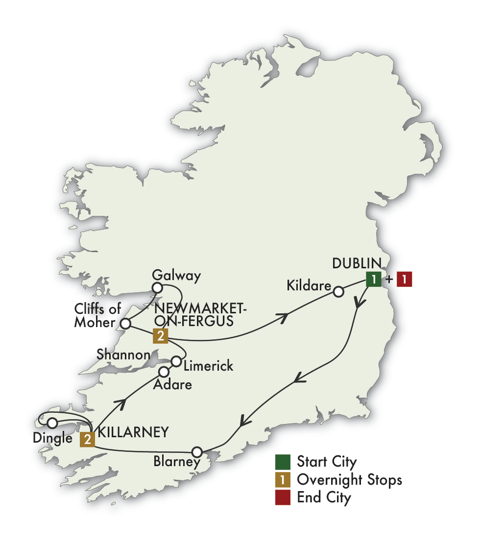 Take a traditional horse-drawn jaunting car through the Killarney National Park to Ross Castle and Kenmare Estate. Visit Moriarty’s in the Gap of Dunloe, a CIE Tours preferred shopping partner. Stop in the picturesque village of Adare, with its thatched cottages and colorful garden, before proceeding to Limerick for a panoramic tour. Dine at a medieval-style feast, where lords and ladies will serenade you with songs and music from days of yore.