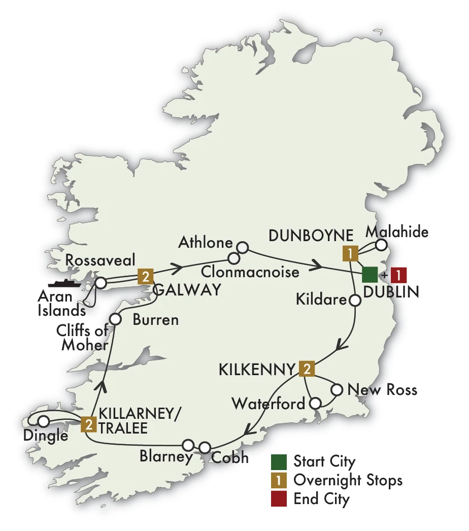 - 8 Breakfasts (B), 2 Lunches (L) and 6 Dinners (D), including a welcome dinner at Dunboyne Castle Hotel.
