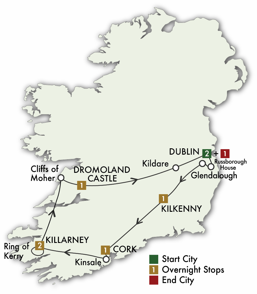Enjoy the delightful scenery of the Wicklow Mountains on the way to Glendalough, once a thriving monastery founded by St Kevin in the 6th century. Walk through the deep valley that attracted monks and scholars from throughout Europe and view the picturesque ruins of a round tower, churches, and Celtic crosses. Next, tour Russborough House, one of Ireland's most beautiful Georgian homes. See its collection of precious art ranging from the Renaissance to the 20th century, and then enjoy an exhilarating encounter: a falconry demonstration, where you can interact with powerful birds of prey under expert guidance. You'll dine this evening at Lyrath Estate Hotel & Spa in the small city of Kilkenny, known as the medieval heart of Ireland.